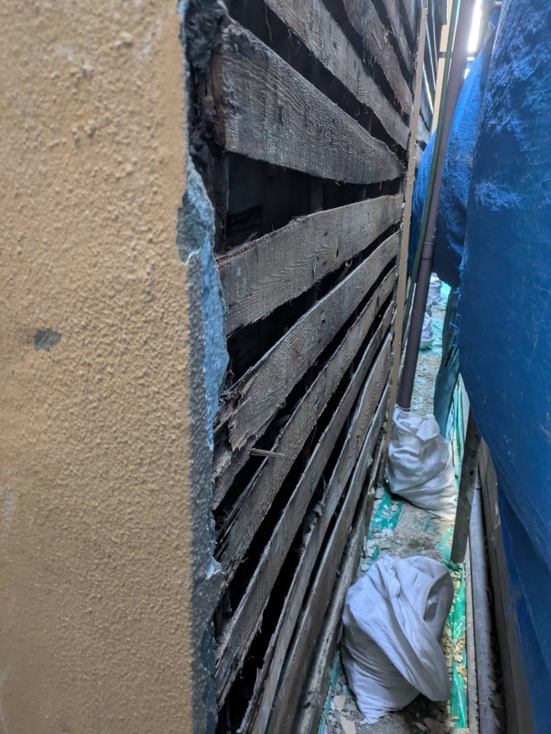 劣化が進んでいる外壁はそのまま残さず、一旦きれいに剥がして下地を確認。