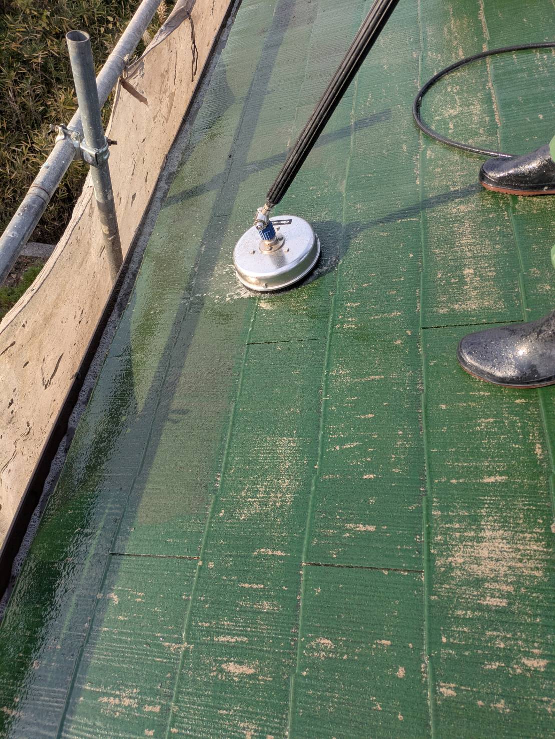 屋根は高圧洗浄で汚れを徹底除去。吸い込みの激しい箇所は下塗り2回施工。下地強化対策。